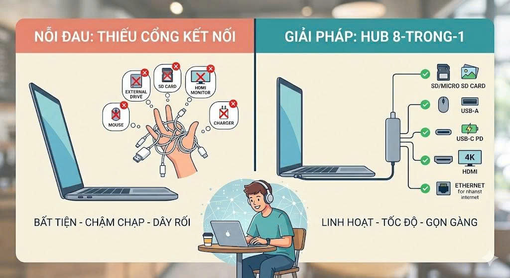 Đối với Gen Z – thế hệ đòi hỏi sự nhanh chóng và đa nhiệm – việc chờ đợi hoặc phải mang theo 5-7 loại adapter rời rạc là một "cực hình". Đây chính là lúc chiếc Hub 8-trong-1 xuất hiện như một vị cứu tinh, gói gọn cả một văn phòng di động vào lòng bàn tay.
