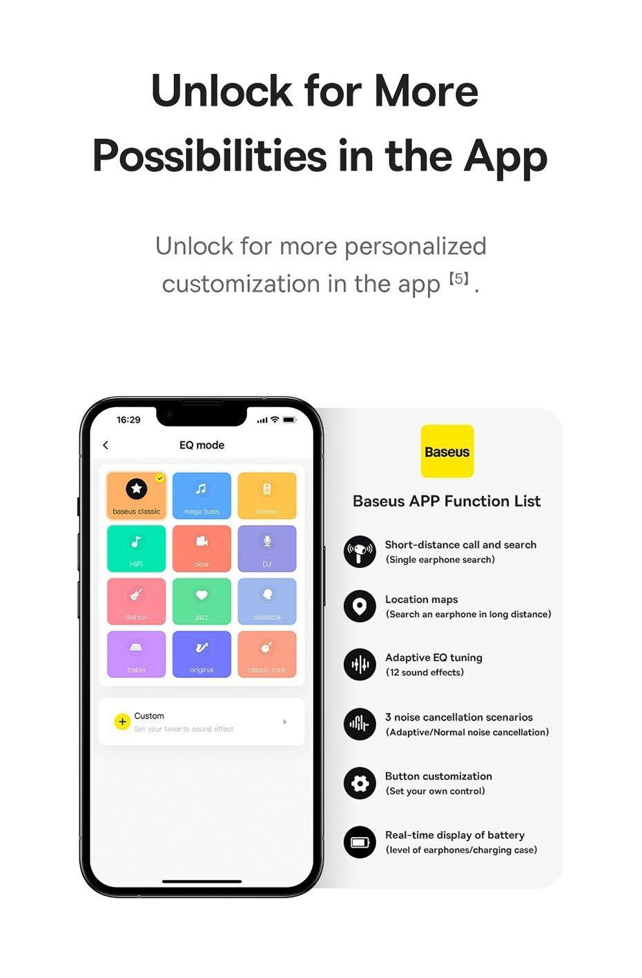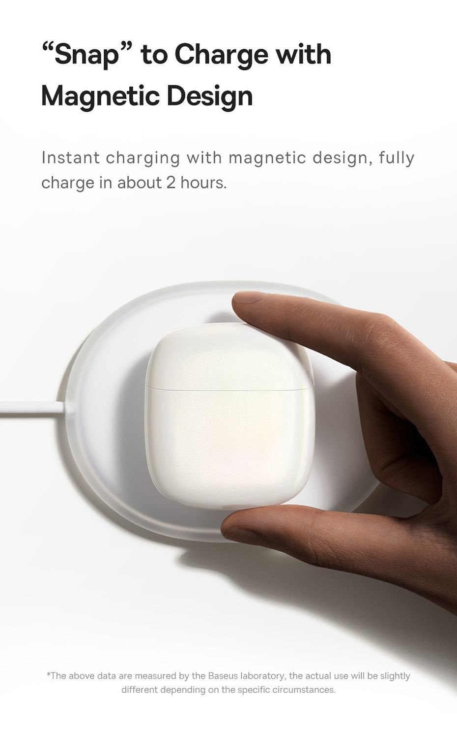 Màng trắng và cuộn dây âm thanh chuyển động được độ chuẩn tổng hợp, cộng với "công nghệ bù âm thanh thông minh Baseus" để tránh mất âm thanh trong chế độ khử tiếng ồn