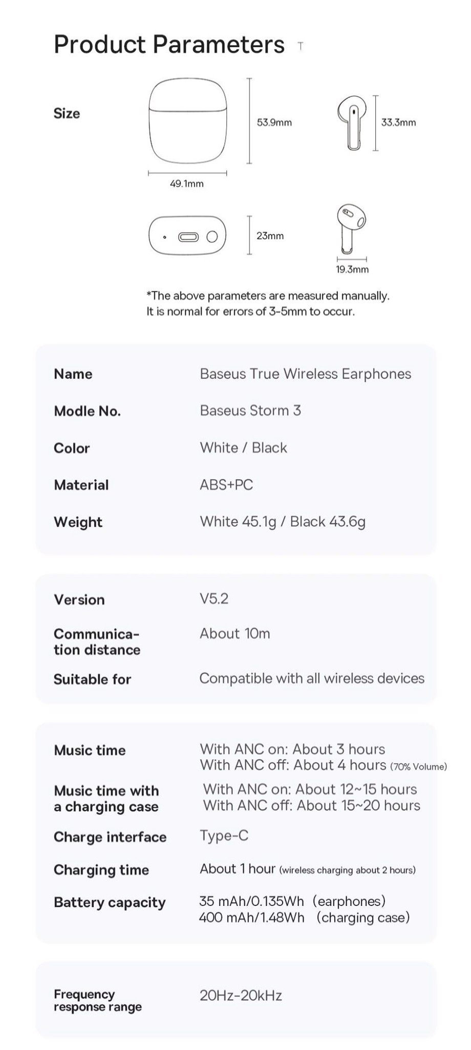 Tính Năng Tai Nghe Bluetooth Cao Cấp Baseus Storm 3 ANC TWS Earphones ( Bluetooth 5.2 , GPS - APP Control, Super Fast charge, Nearly No-delay, Hifi & HD Stereo Gaming Earbuds )