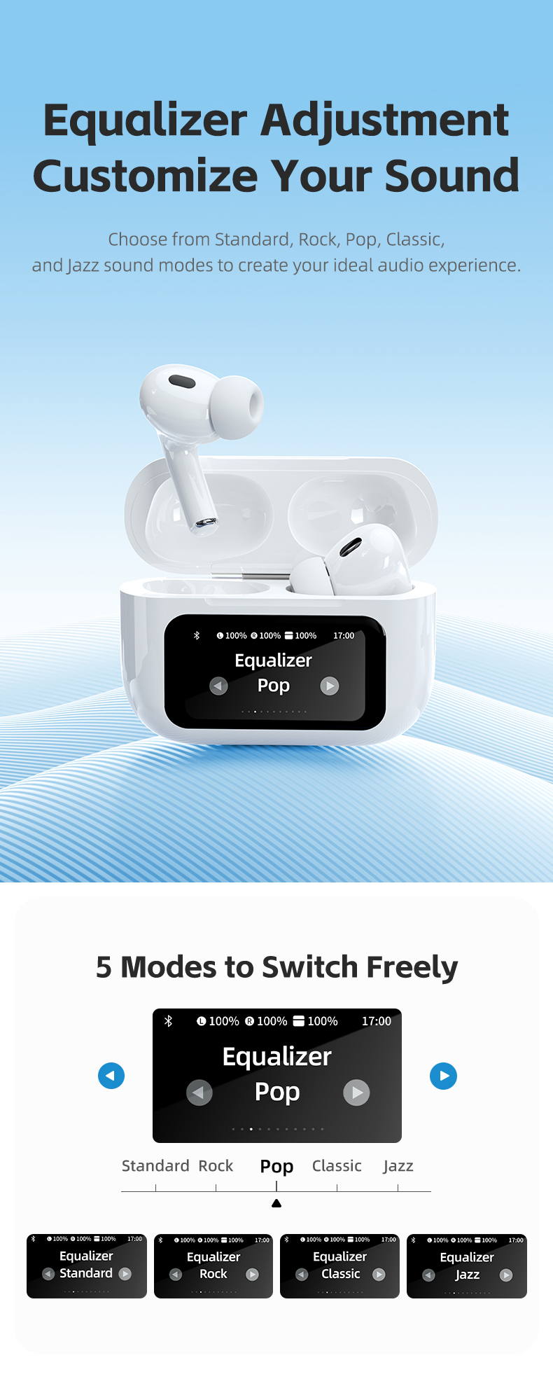 Màn hình LCD full color cảm ứng trên hộp sạc giúp theo dõi dung lượng pin từng tai, chuyển đổi chế độ nghe (Music/Gaming), chọn hiệu ứng hình nền theo phong cách cá nhân cực tiện lợi.