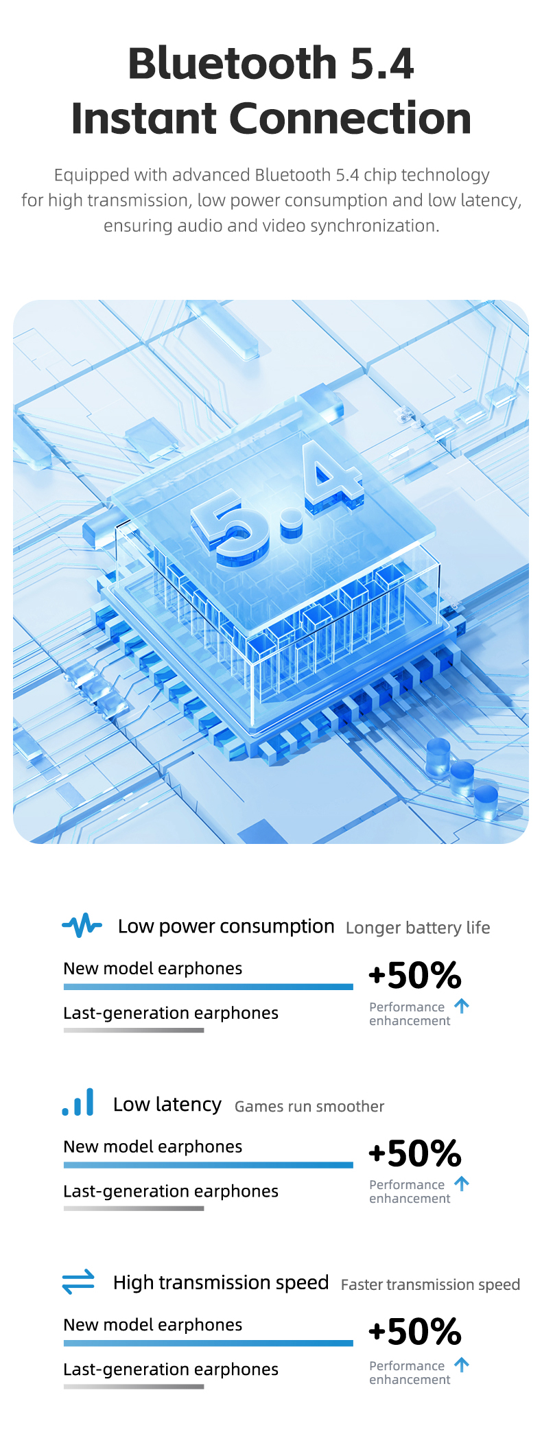 Chuẩn Bluetooth 5.4 thế hệ mới nhất cho tốc độ truyền tín hiệu cực nhanh, ổn định trong bán kính 10m, kết nối tự động khi mở hộp