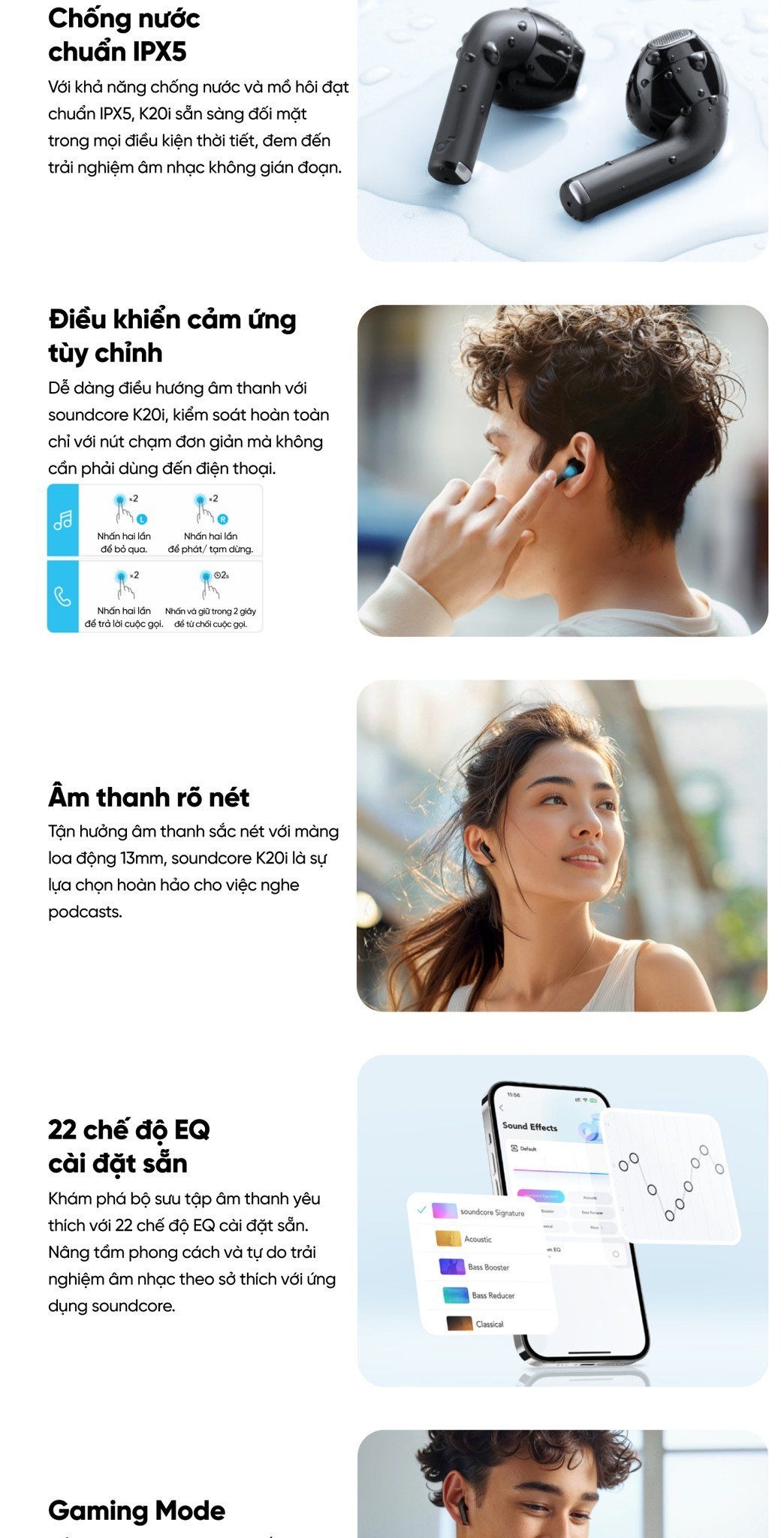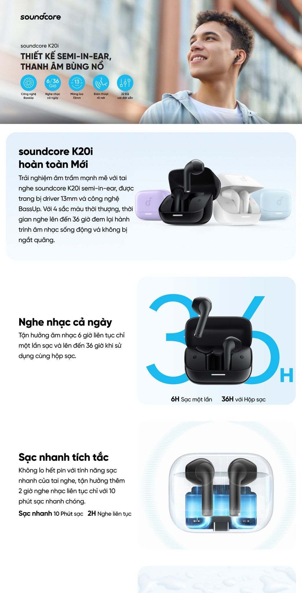 - Phù hợp nhiều thể loại nhạc: Tai nghe Anker Soundcore K20i - A3994 phù hợp với nhiều thể loại nhạc khác nhau, từ pop, rock đến EDM, hip-hop.