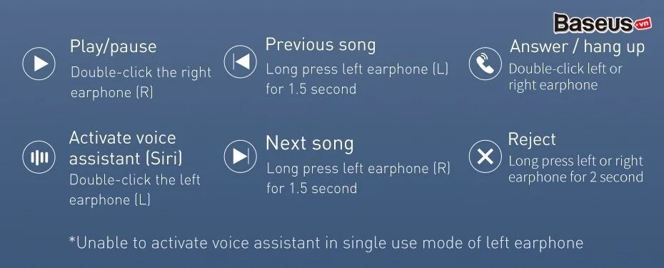 - Từ chối cuộc gọi:Khi có cuộc gọi, chạm giữ tai phải (R) hoặc trái (L) khoảng 2 giây
