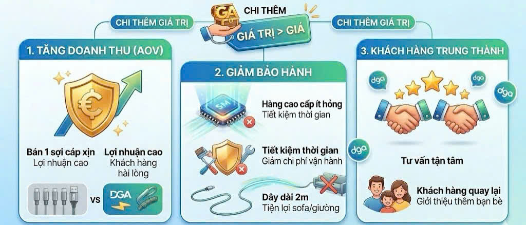 Tăng doanh thu trung bình trên mỗi đơn hàng (AOV): Thay vì bán 5 sợi cáp rẻ, bạn chỉ cần bán 1 sợi cáp xịn với biên lợi nhuận cao hơn và khách hàng hài lòng hơn.