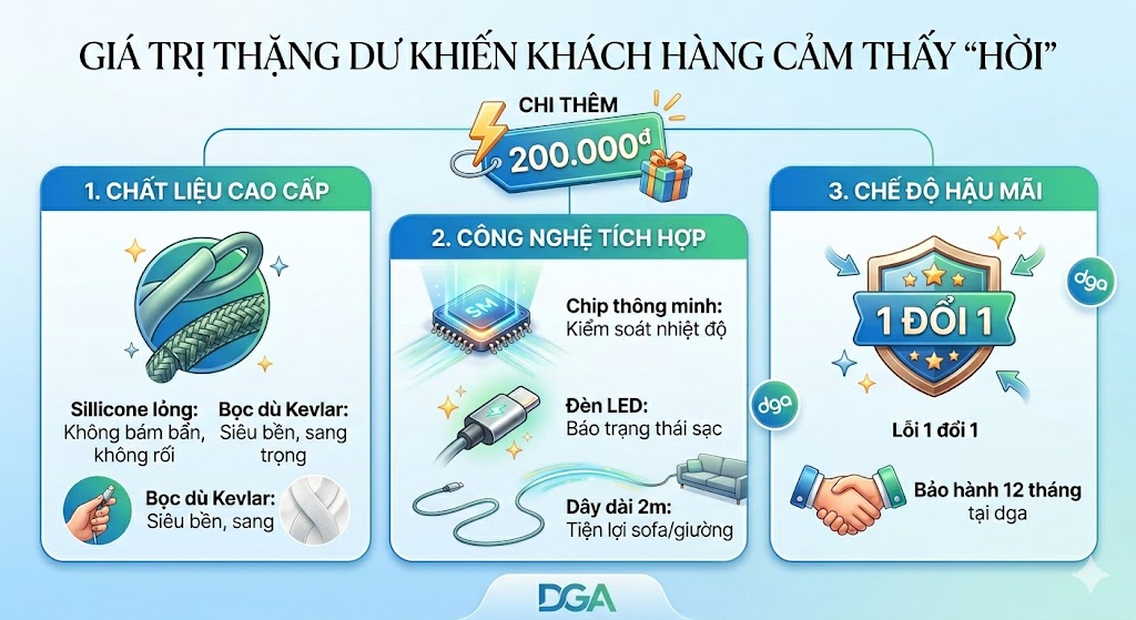 Chế độ hậu mãi: Một sợi cáp 50k thường không có bảo hành. Một sợi cáp cao cấp tại dga thường đi kèm chế độ lỗi 1 đổi 1 trong 12 tháng. Đây là cam kết mạnh mẽ nhất về chất lượng.
