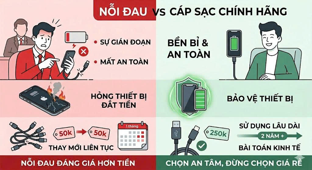 Nỗi đau về sự gián đoạn: Hãy tưởng tượng khách hàng đang chuẩn bị cho một cuộc họp quan trọng hoặc sắp ra sân bay, nhưng sợi cáp bỗng dưng "giở chứng", sạc lúc được lúc không. Sự bực bội này đáng giá hơn nhiều so với con số 200.000đ chênh lệch.