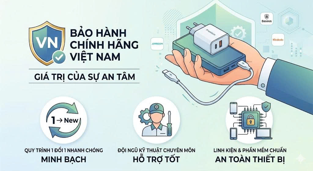 Mua một chiếc củ sạc hay pin dự phòng "xách tay" có thể rẻ hơn vài chục nghìn đồng, nhưng khi hỏng hóc, bạn sẽ đối mặt với cảnh "đem con bỏ chợ". Bảo hành chính hãng thông qua nhà phân phối tại Việt Nam mang lại những lợi ích vượt trội: