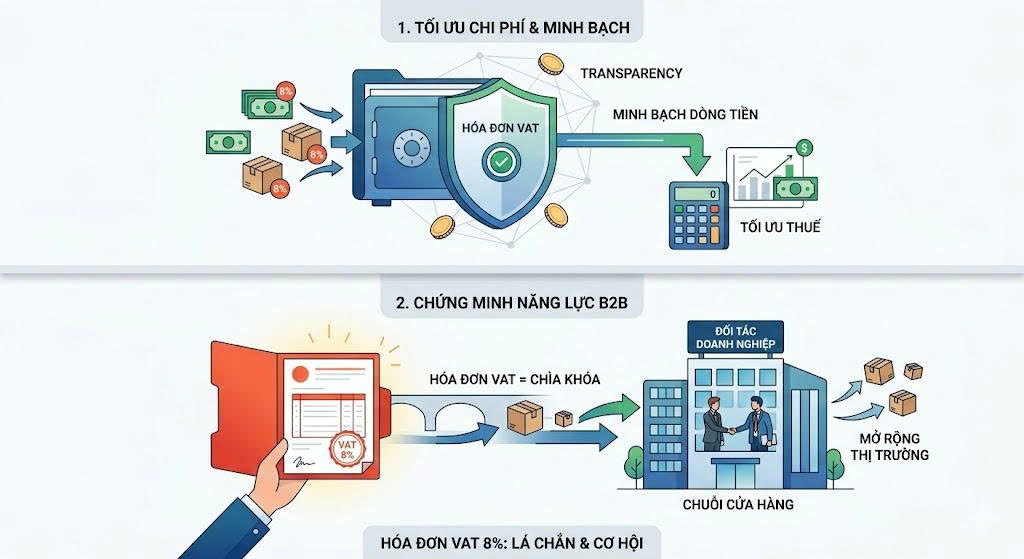 Tối ưu chi phí thuế: Khi bạn nhập hàng chính ngạch có VAT 8%, đây là chi phí đầu vào hợp lệ. Điều này giúp doanh nghiệp/hộ kinh doanh minh bạch được dòng tiền, dễ dàng quyết toán thuế và tránh bị áp thuế khoán quá cao một cách cảm tính.