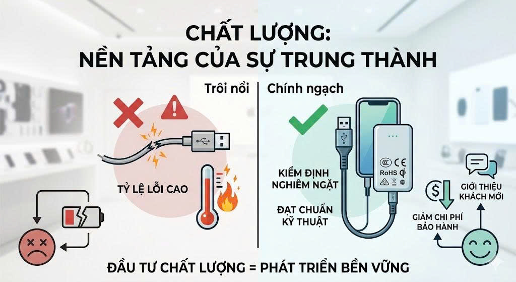 Khi bán hàng chất lượng, tỷ lệ khách quay lại phàn nàn sẽ giảm xuống tối thiểu. Điều này không chỉ giúp bạn tiết kiệm chi phí vận hành bảo hành mà còn bảo vệ uy tín của thương hiệu cửa hàng. Một khách hàng mua được sợi cáp sạc dùng 2 năm không hỏng sẽ giới thiệu cho 10 người khác – đó là marketing không đồng hiệu quả nhất.