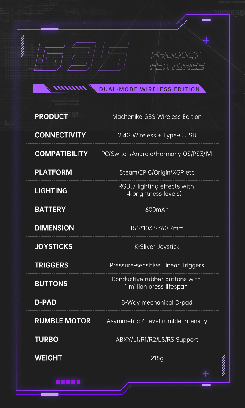 Tay cầm chơi game không dây Machenike G3s Dual-Mode là một thiết bị chơi game cao cấp, mang đến cho bạn trải nghiệm chơi game tuyệt vời với thiết kế hiện đại, hiệu năng vượt trội và khả năng kết nối đa dạng. Với G3s, bạn có thể tận hưởng những trận game đỉnh cao trên nhiều nền tảng khác nhau như PC, laptop, điện thoại Android và Nintendo Switch.