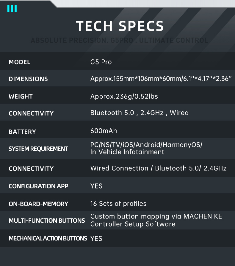 Nâng cấp với các switch Kailh cho D-pad, tay cầm chơi game Machenike G5 Pro mang lại độ phản hồi nhanh và cảm giác nhấn chắc chắn, cùng với hai nút lưng elite có thể lập trình, cho phép tạo macro tùy chỉnh qua phần mềm độc quyền của Machenike. Mỗi chi tiết được thiết kế để khai thác tối đa tiềm năng trong mỗi trò chơi.