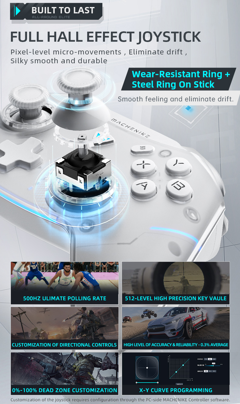 Tay cầm chơi game Machenike G5 Pro là sự kết hợp hoàn hảo của công nghệ và thiết kế, với trái tim là hệ thống Cảm Biến Hall đầy đủ, mang lại trải nghiệm điều khiển game vô cùng chính xác. Công nghệ joystick Hall không chỉ loại bỏ hoàn toàn hiện tượng drift mà còn cung cấp đầu ra chính xác cao nhờ vào cảm ứng điện từ tinh vi. Sự kết hợp của vòng kim loại và POM không chỉ tăng cường độ mượt mà khi sử dụng mà còn đảm bảo độ bền cho tay cầm.