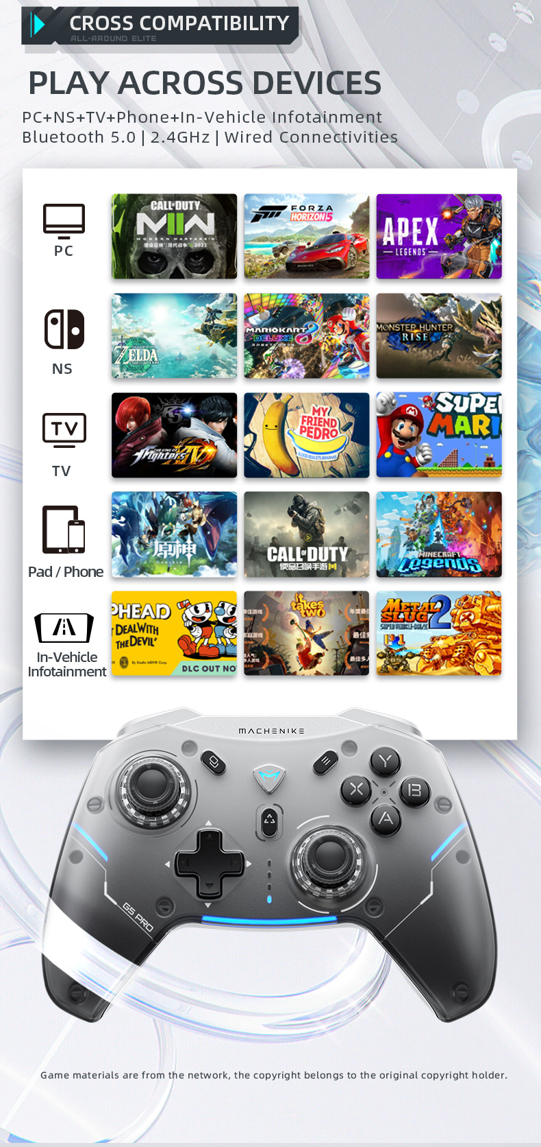 Gamepad Machenike G5 Pro khẳng định vị thế là một thiết bị đa năng khi tương thích với hầu hết các nền tảng chơi game hiện nay, từ PC, Mac, Nintendo Switch cho đến iPhone, Android, và thậm chí là hệ thống giải trí trong ô tô của bạn. Sự linh hoạt này giúp mẫu tay cầm chơi game phân khúc dưới 1 triệu này trở thành lựa chọn lý tưởng cho game thủ muốn trải nghiệm game mượt mà trên mọi thiết bị, đồng thời dễ dàng chuyển đổi giữa các nền tảng mà không gặp bất kỳ trở ngại nào.