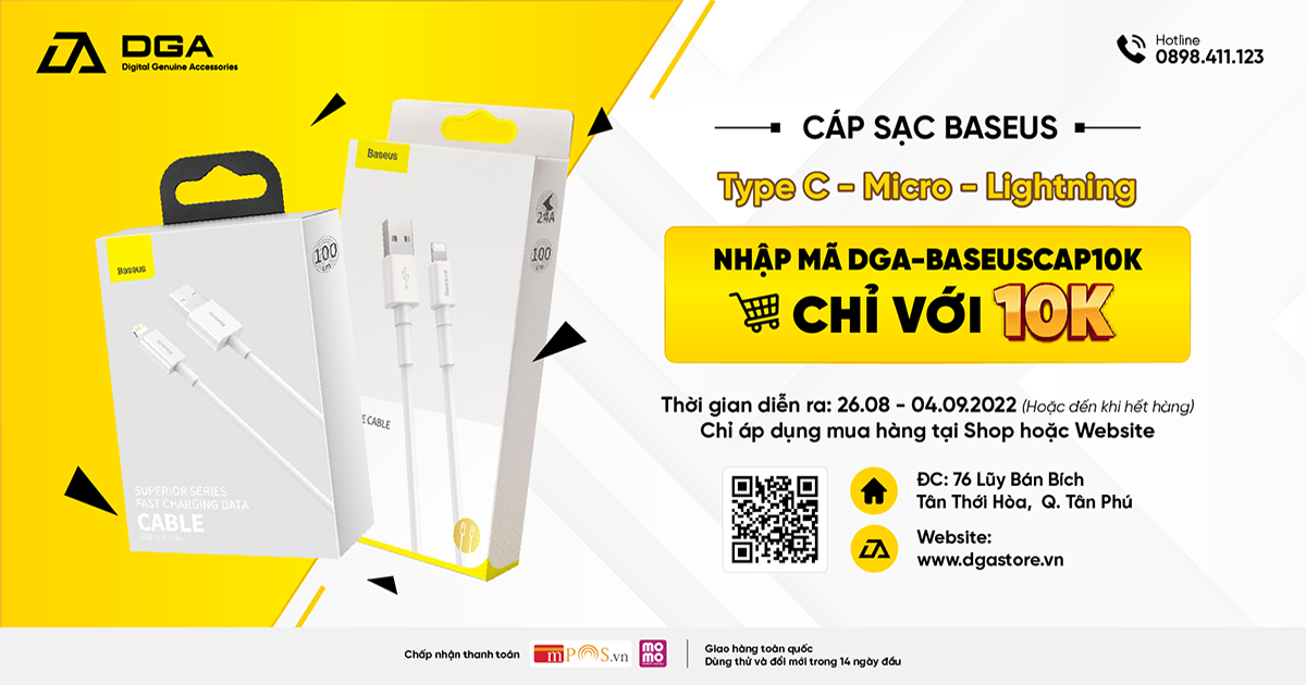 Từ ngày 26/08 đến ngày 04/09, DGA Store tung hàng loạt chương trình khuyến mãi cực sốc như Sắm cáp sạc chính hãng chỉ 10k & Giảm giá các sản phẩm phụ kiện điện thoại, đèn, thiết bị công nghệ thông minh lên đến 70%
