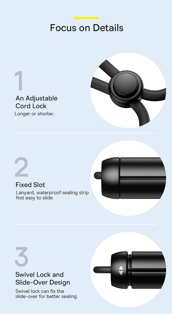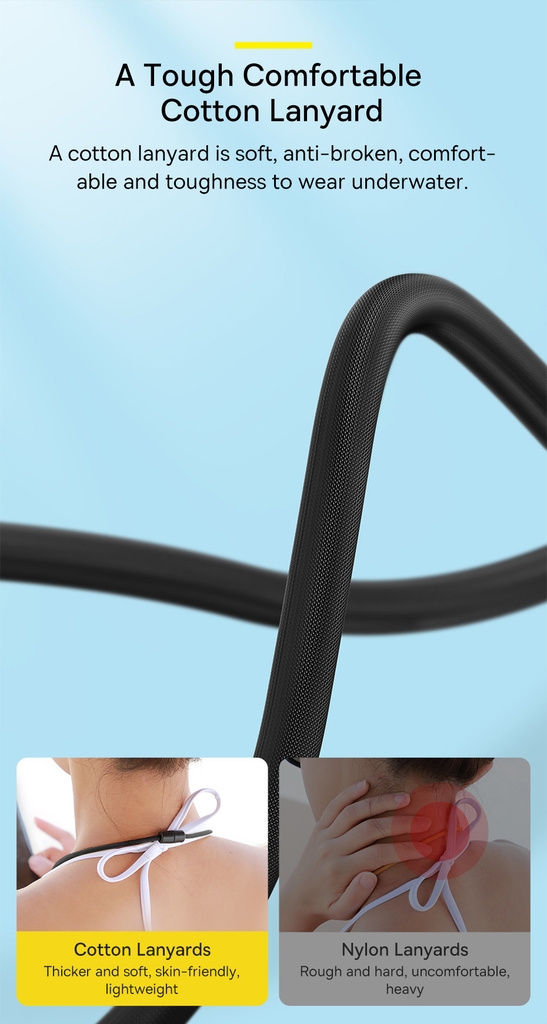 - Đi kèm với túi chống nước là sợi dây đeo làm từ vải trông rất chắc chắn có thể tháo rời. Khi muốn đeo lên cổ để rảnh tay làm việc khác, bạn chỉ cần gắn dây đeo vào và đeo lên.