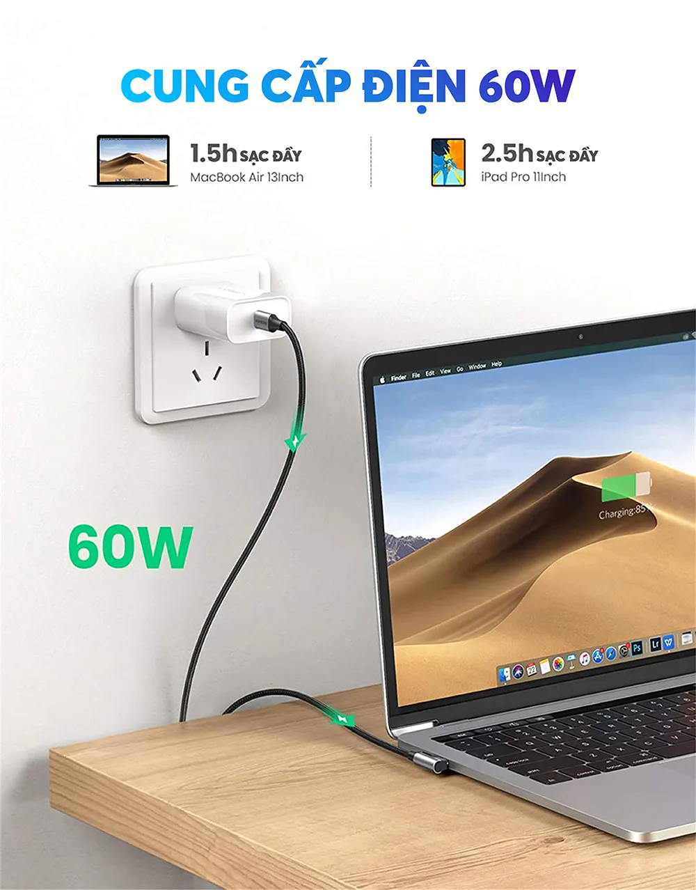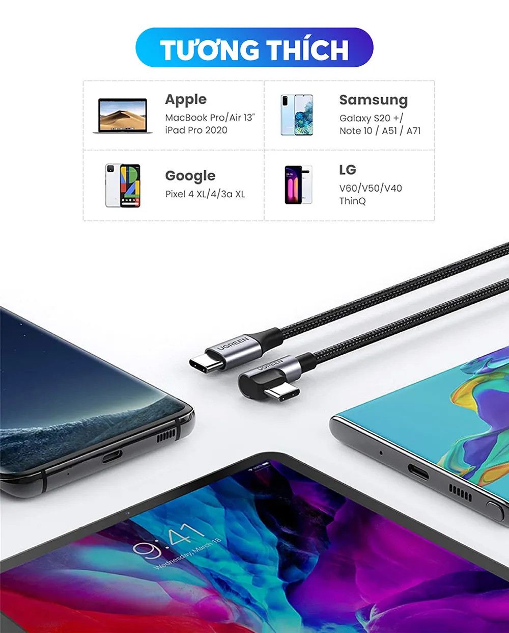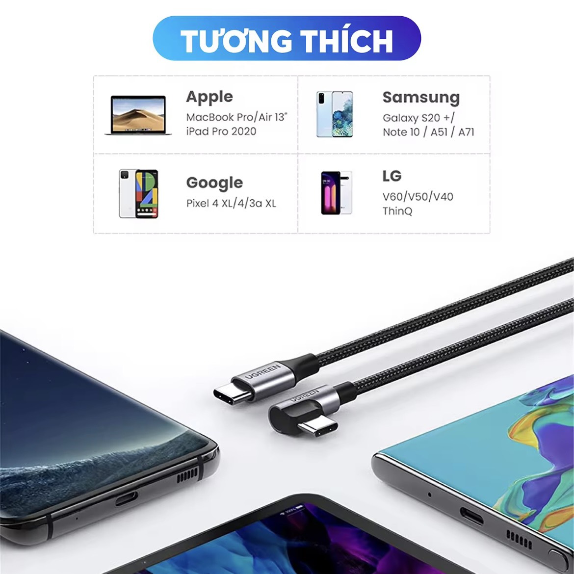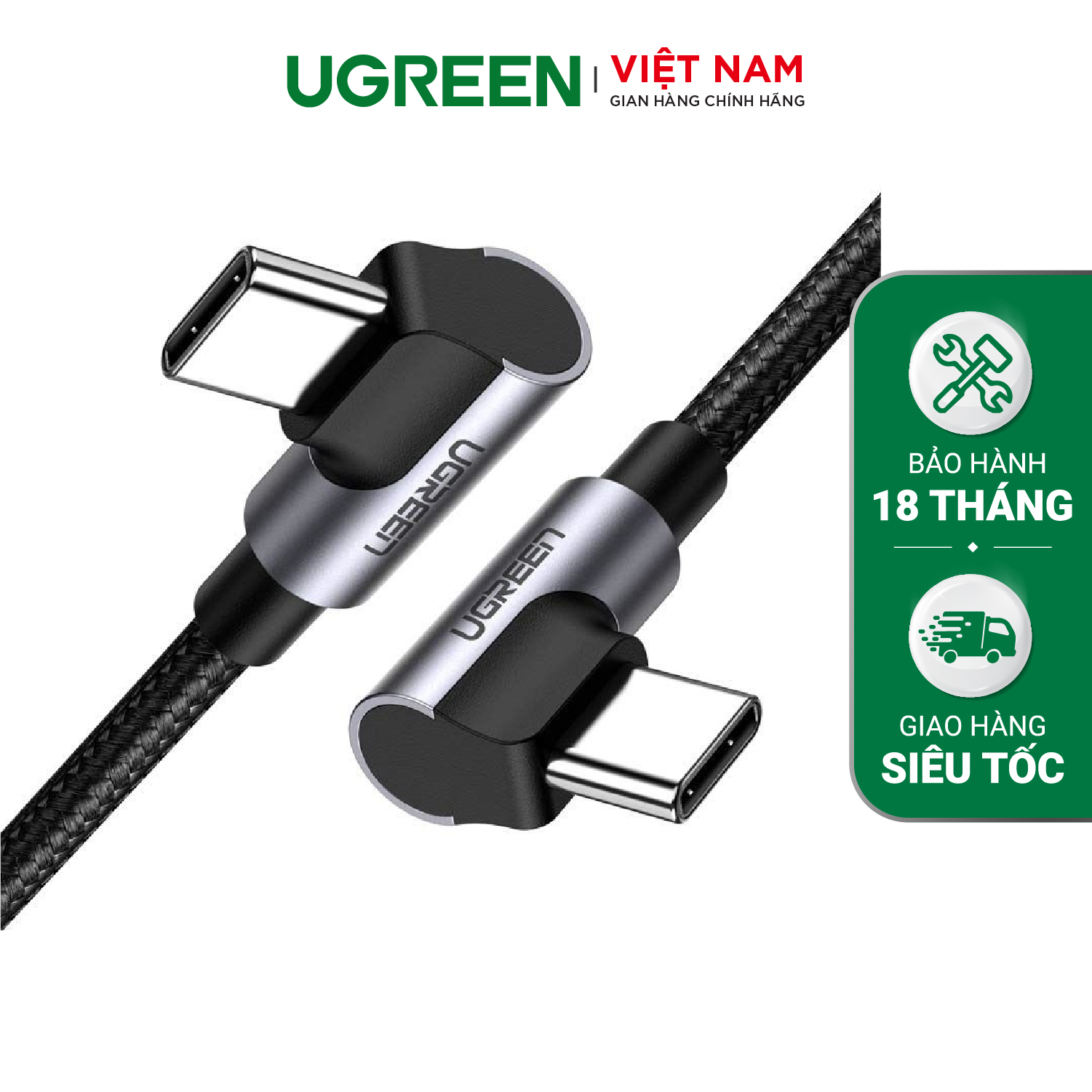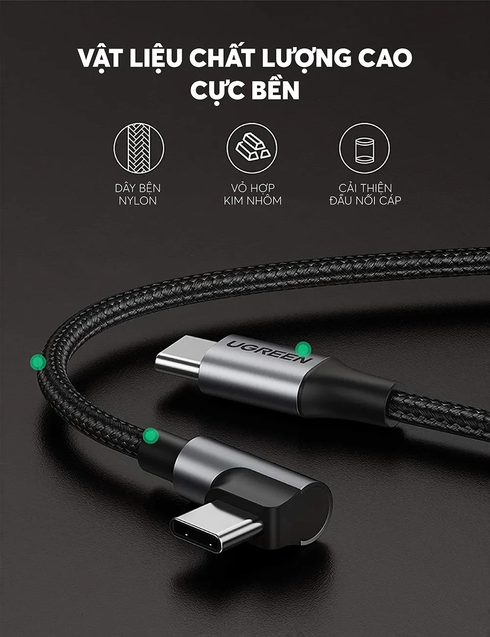 – Cáp UGREEN USB-C to USB-C với thiết kế sáng tạo 90 độ L, tiện lợi và thoải mái hơn rất nhiều cho việc chơi game, xem video trong khi sạc.