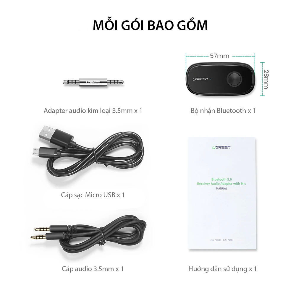 Sản phẩm đi kèm với 1 bộ nhận Bluetooth đầu cái 3.5mm, 1 cổng 3.5mm 2 đầu đực,1 sạc