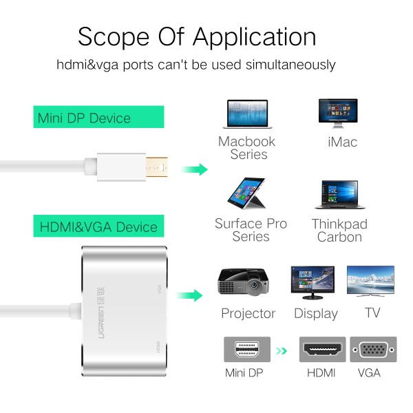 Cáp Ugreen 20421 dùng cho Dell, Surface pro, HP, MacBook, MacBook Pro, hay MacBook Air với một cáp mini DisplayPort sang HDMI hoặc VGA xuất ra tivi hay máy chiếu rất đẹp và sắc nét. Với độ phân giải 4K*2K/30Hz cho cổng HDMI và 1920x1200P/ @ 60Hz cho cổng VGA. Kết nối từ Macbook qua màn hình TV thật dễ dàng, cắm là chạy, không cần các thiết bị hỗ trợ cũng như phần mềm phức tạp.