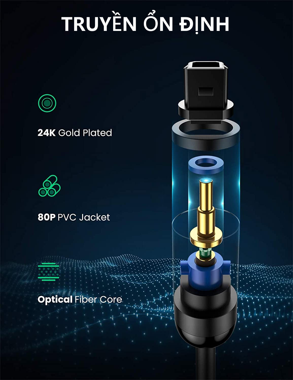 Cáp Optical còn được gọi với tên khác là cáp quang siêu dẫn là cáp tín hiệu âm thanh tốc độ cao với chất liệu vỏ là hợp chất Duraflex. Cáp Optical chống nhiễu tín hiệu cực kì ổn định bởi được sơn 1 lớp sơn phủ ngoài đảm bảo tín hiệu đi dúng hướng. Đầu sợi quang được mạ vàng, làm bóng hoàn hảo