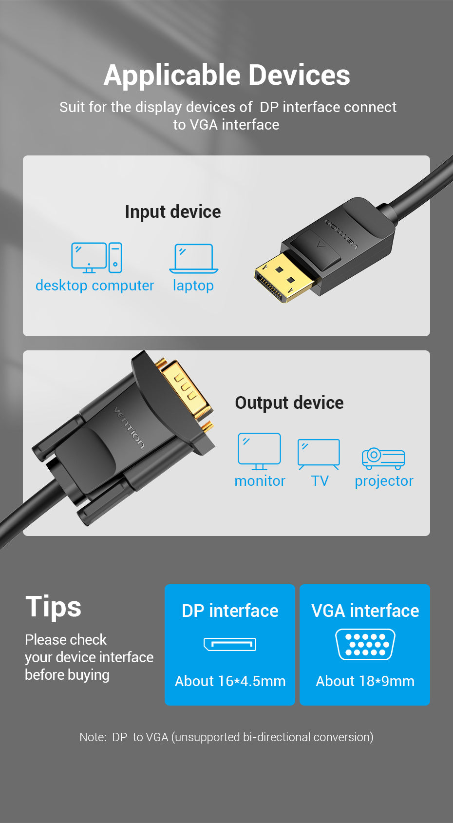 Chỉ hỗ trợ một chiều, từ DP (máy tính, laptop, card đồ họa...) sang VGA (màn hình, máy chiếu, TV...).