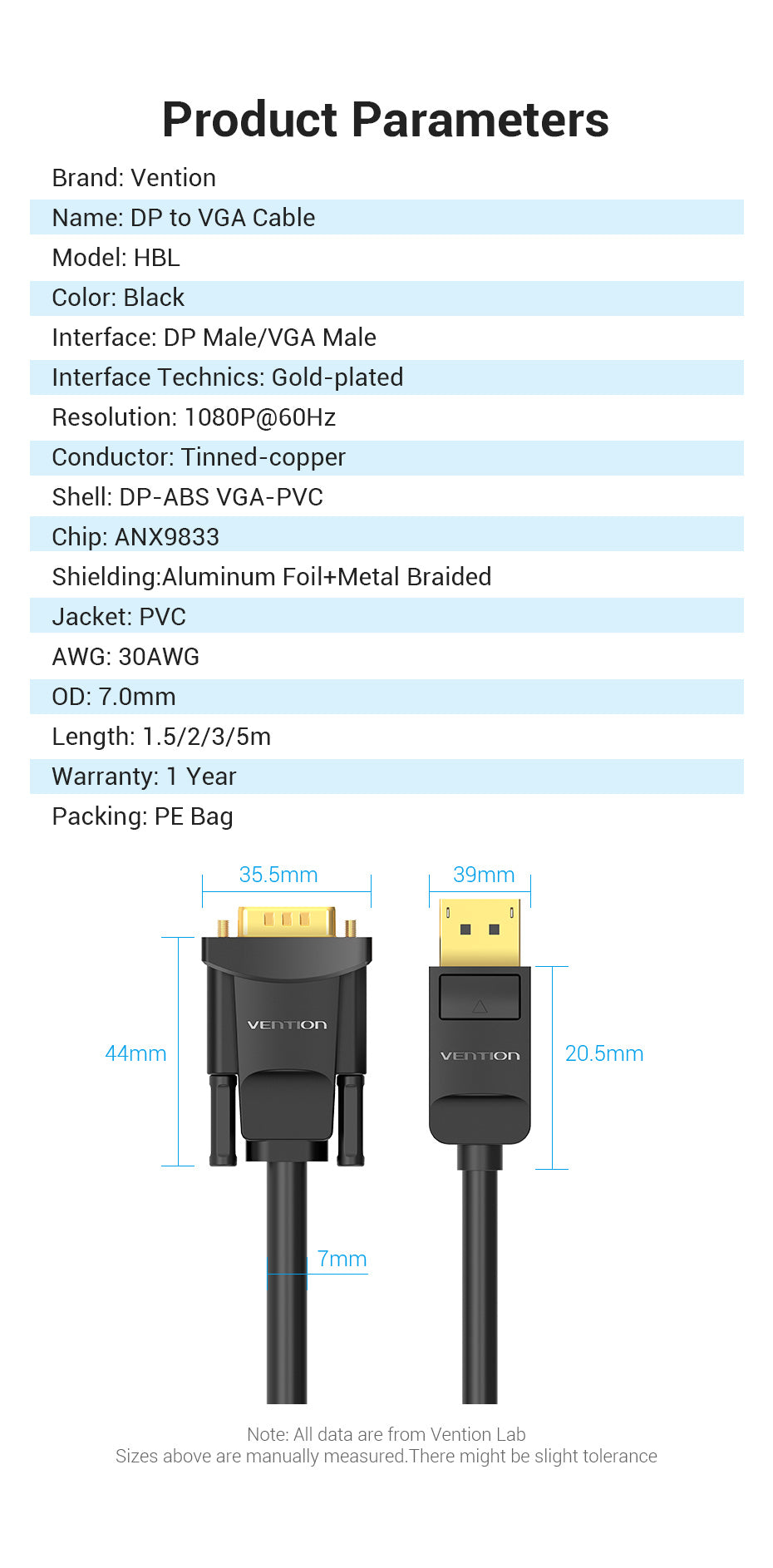 Hình Ảnh Cáp Chuyển DP to VGA 1080p VENTION HBL (1080p@60Hz)